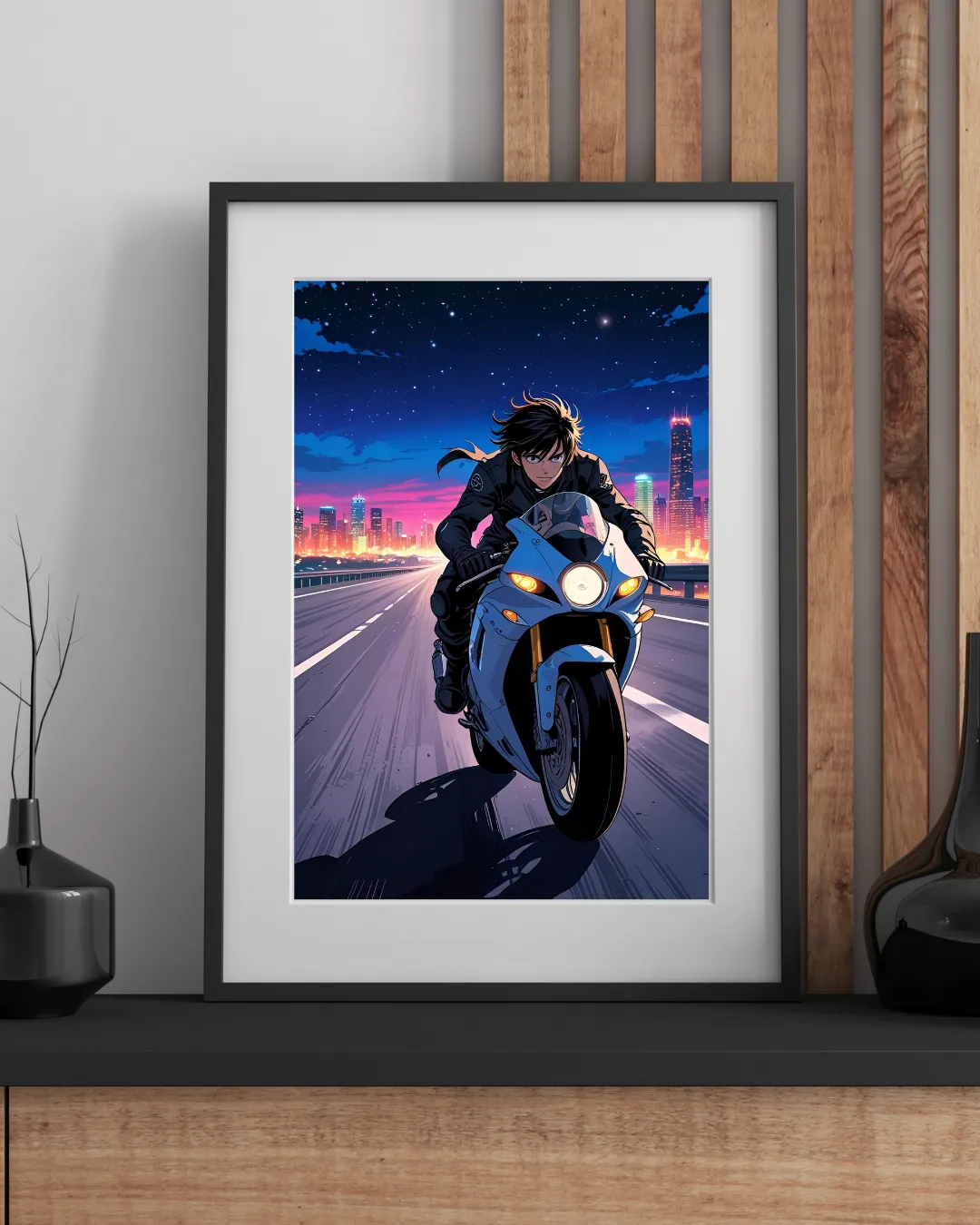 Un joven en moto de velocidad avanza en primer plano por una carretera al amanecer, con la ciudad al fondo y un cielo que mezcla las últimas estrellas de la noche con los primeros rayos del sol, en vibrante estilo anime.