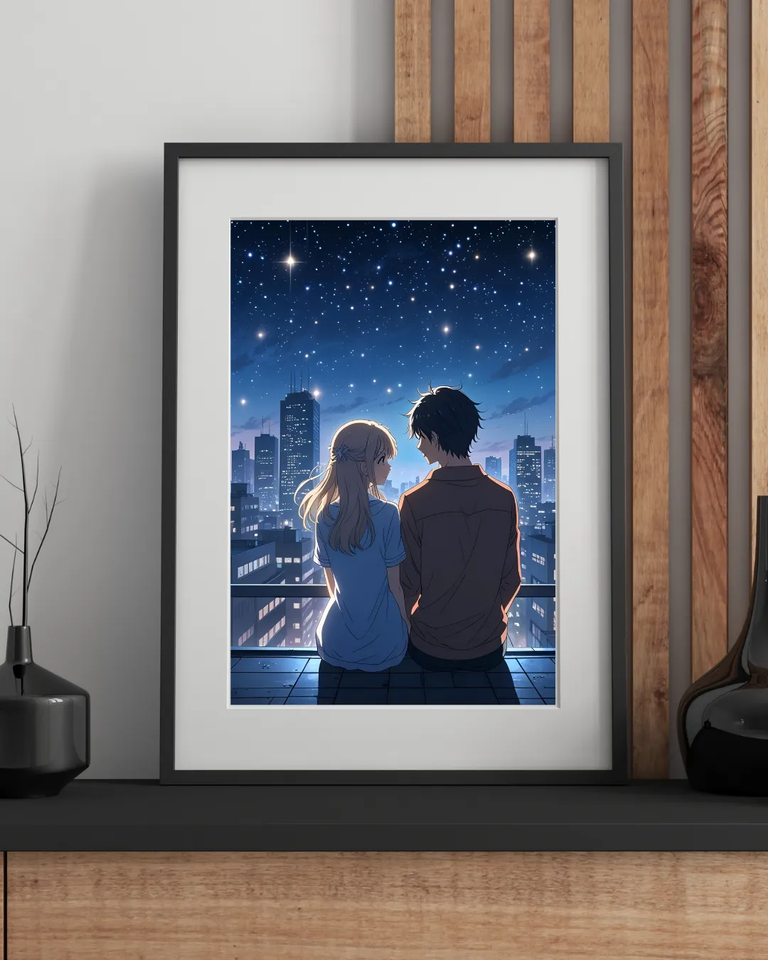 Una pareja sentada en el balcón de su departamento observa juntos el horizonte de la ciudad, creando un ambiente romántico y lleno de calma.