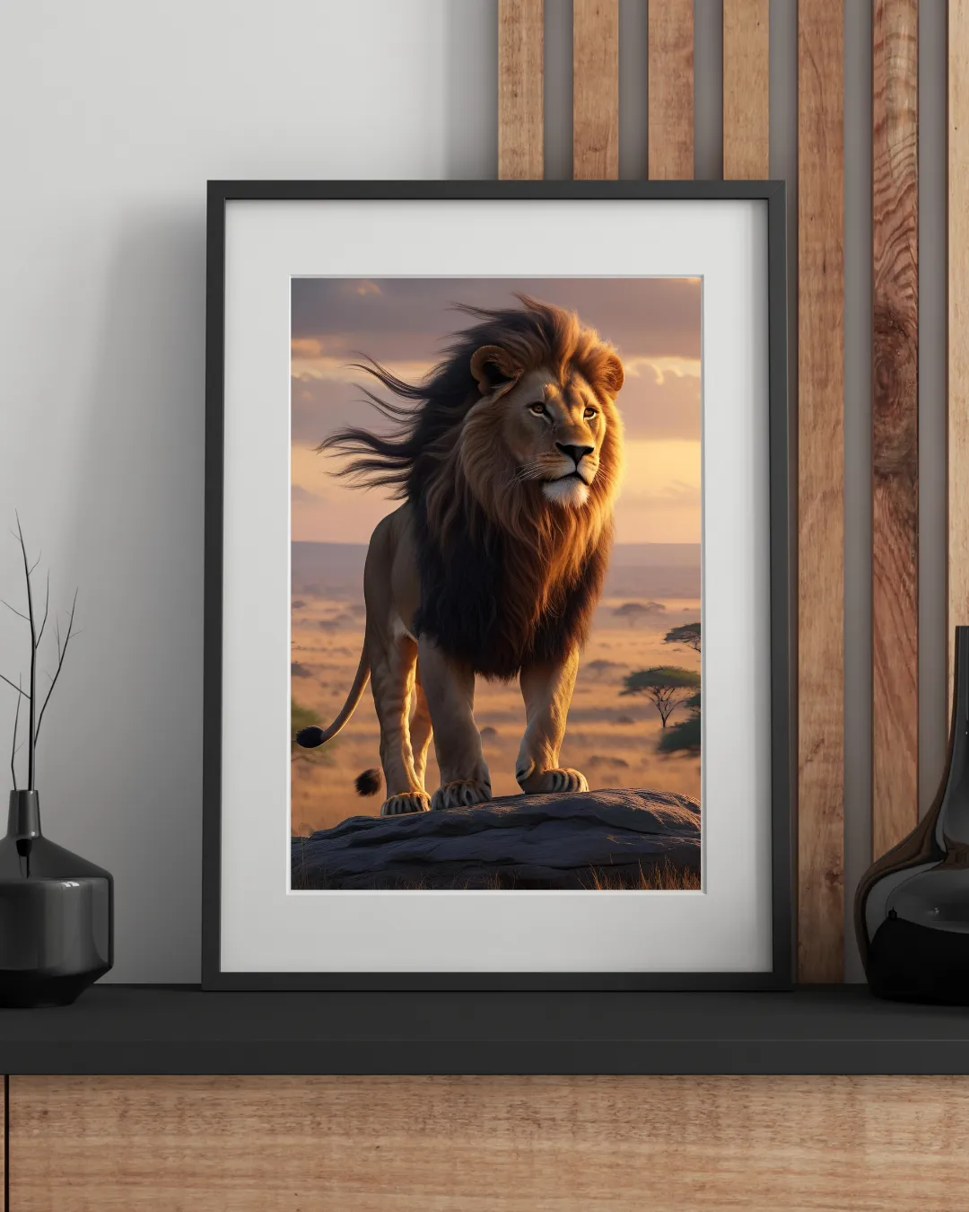 Un majestuoso león posado sobre una gran roca, observando su reino con mirada imponente.