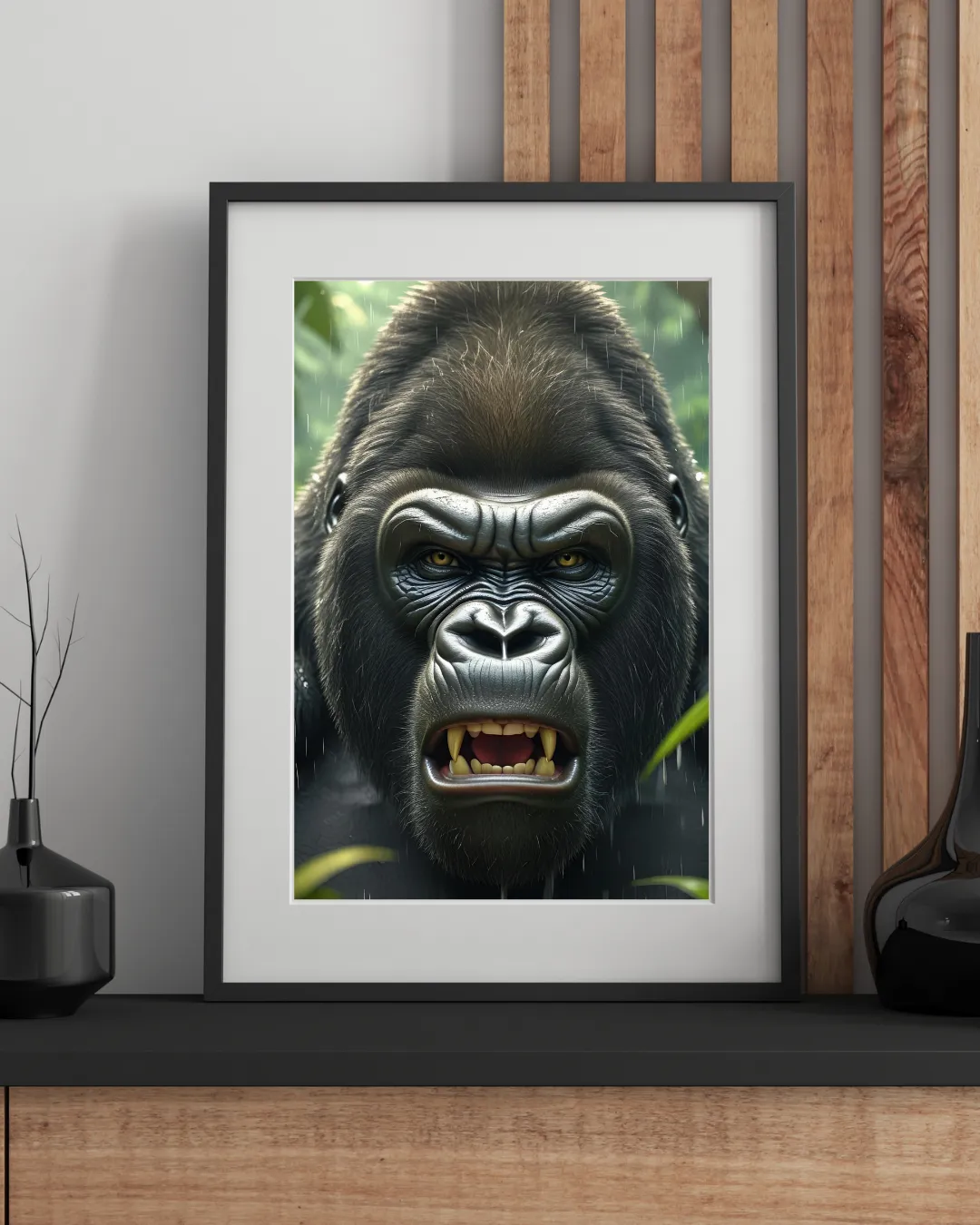 Un retrato imponente de un gorila, mostrando cada detalle de su rostro y la intensidad de su mirada.
