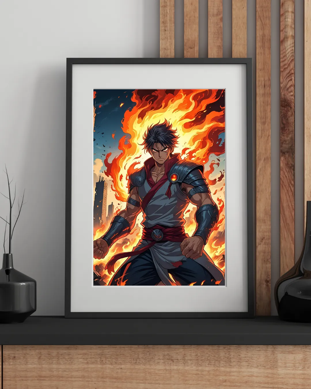 Un hombre guerrero con armadura se muestra en primer plano, mientras fuego emerge de su interior como señal de un poder sobrenatural, con una ciudad destruida por la guerra de fondo.