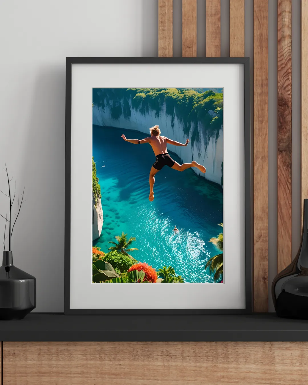 Un salto desde un acantilado hacia una laguna tropical, congelado en el aire. Acción pura con colores brillantes.